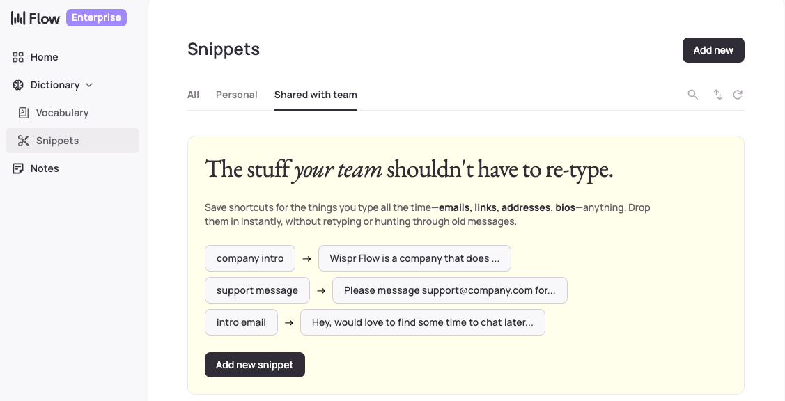 2) Team Snippets let you create voice shortcuts for the things your team says repeatedly, like scheduling links, customer follow-ups, and FAQs. Just say the word and Flow inserts the fully polished text.